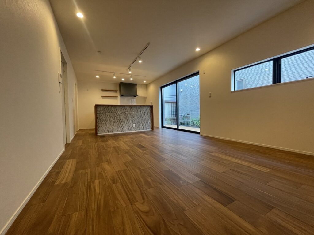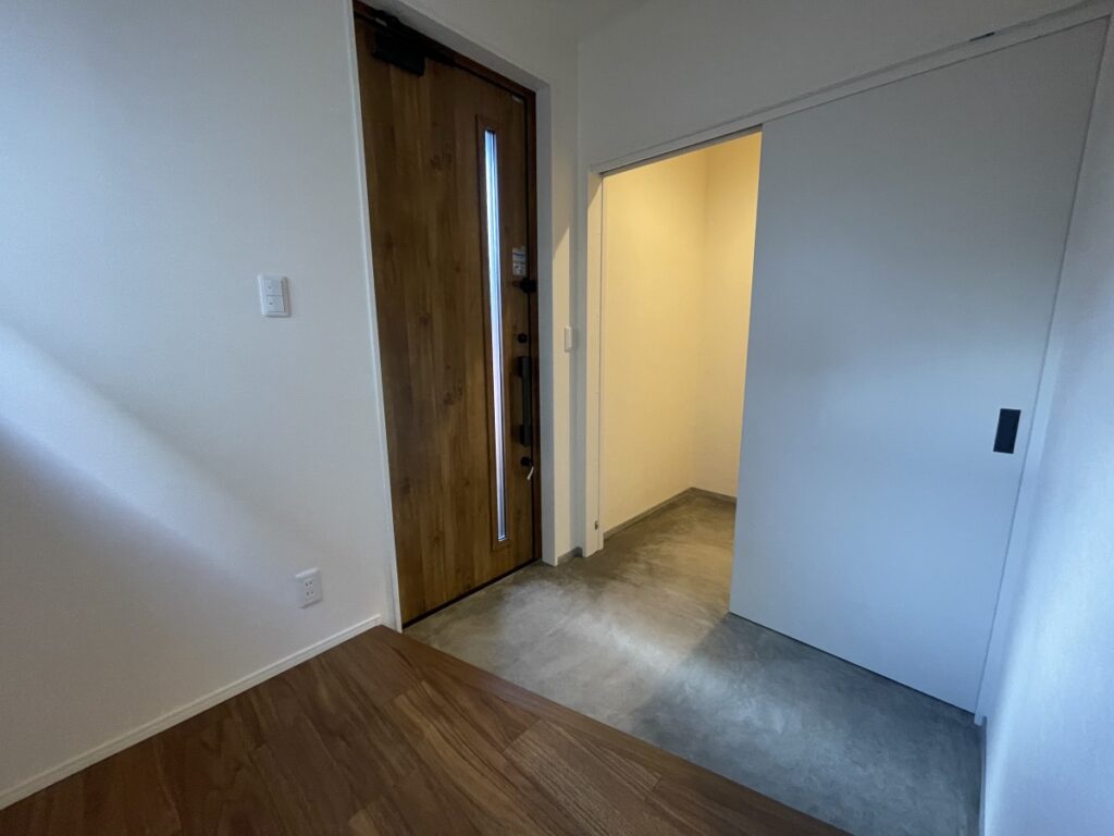 一般的には玄関の床仕上げは磁器タイルとなることが多いですが、建物のアプローチからの繋がりを重視しモルタル左官仕上げとなっています。玄関のシューズクロークも十分な容積を持っていますので、自転車を入れたり、ベビーカーを置いたり、使い方は住む人の工夫で色々と変化できます。