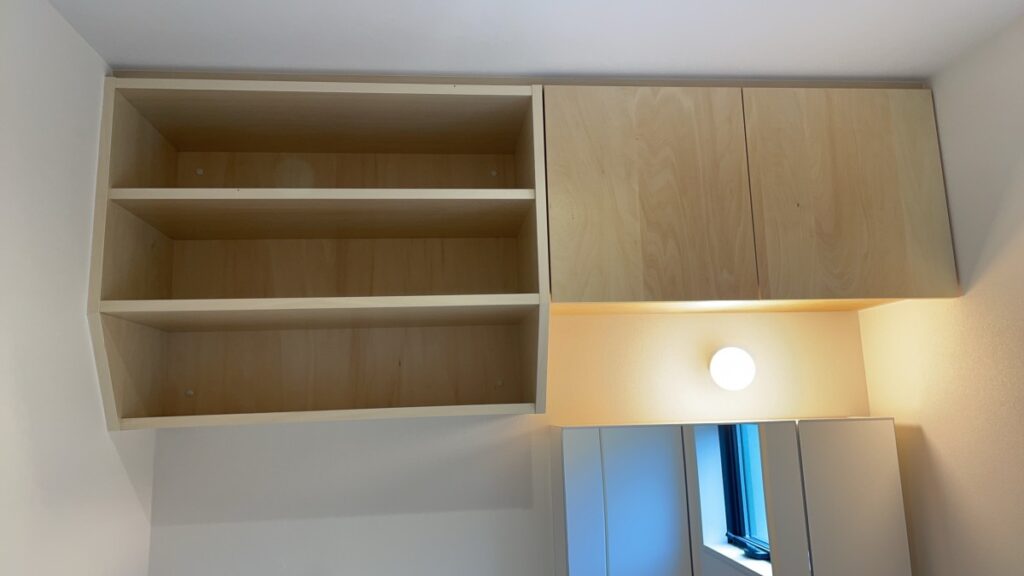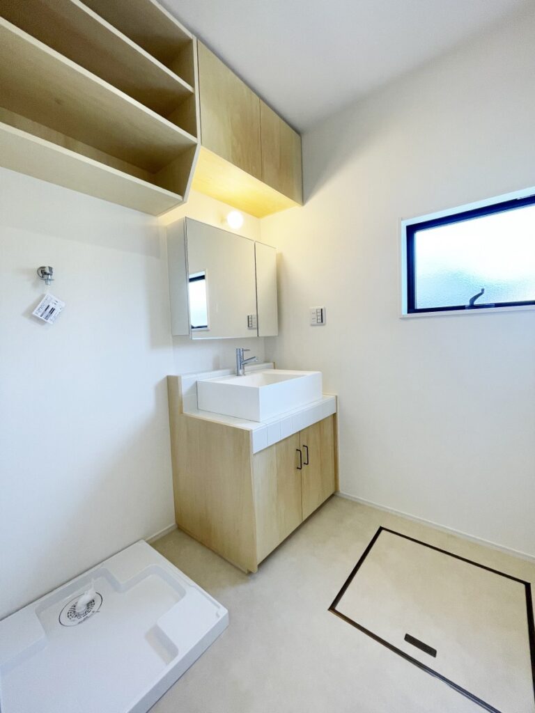 洗面台の背面には可動棚式リネン庫を設け、洗面室で使うタオルなどの収納できるようになっております。