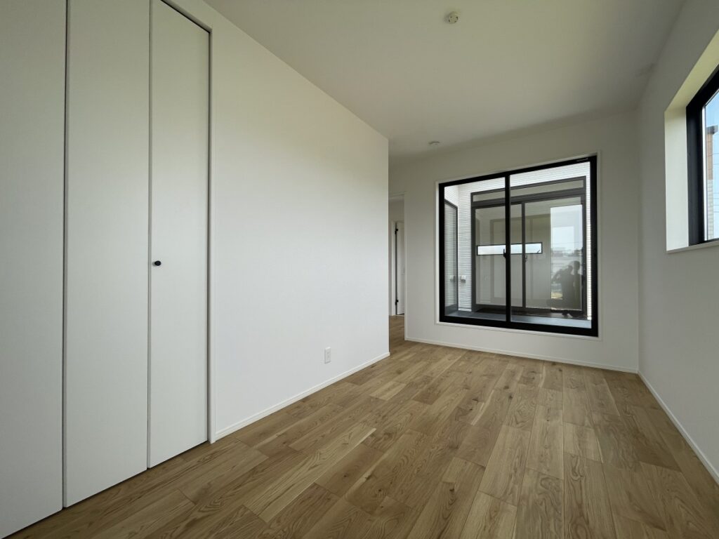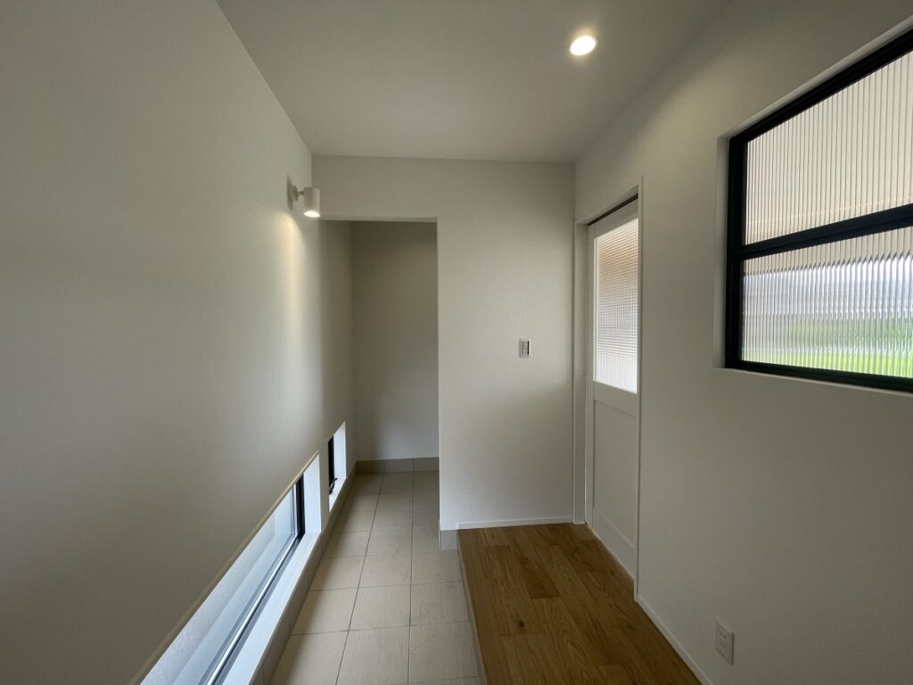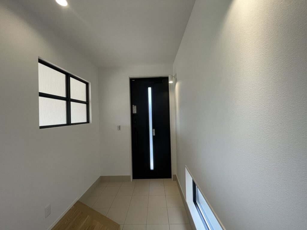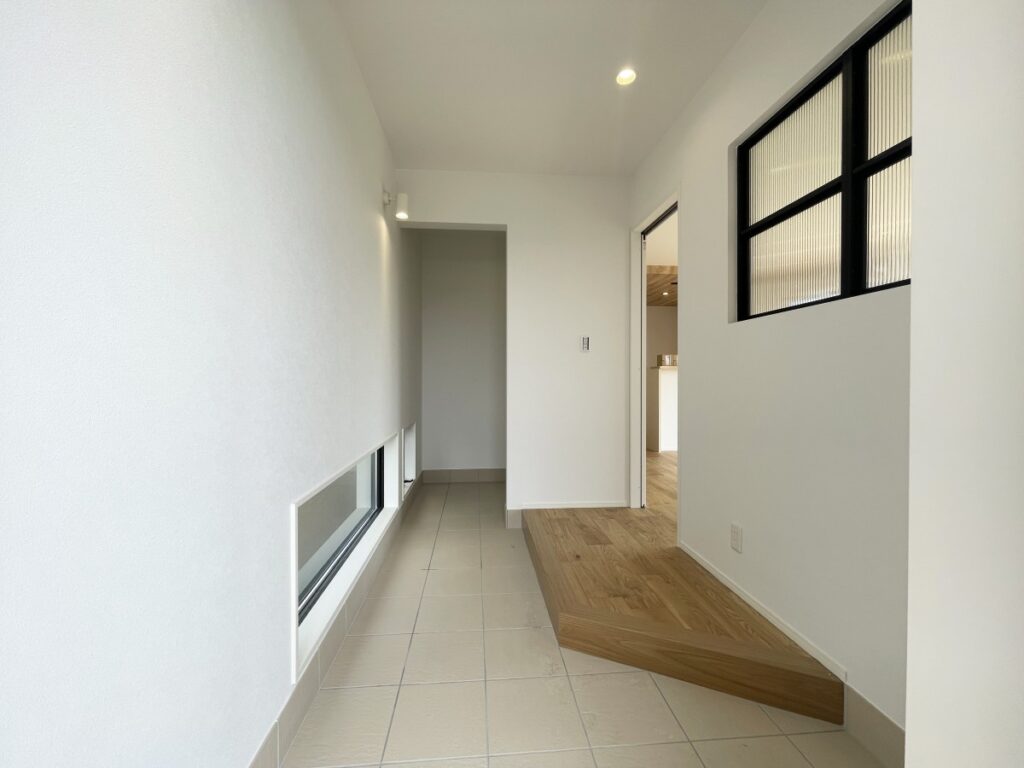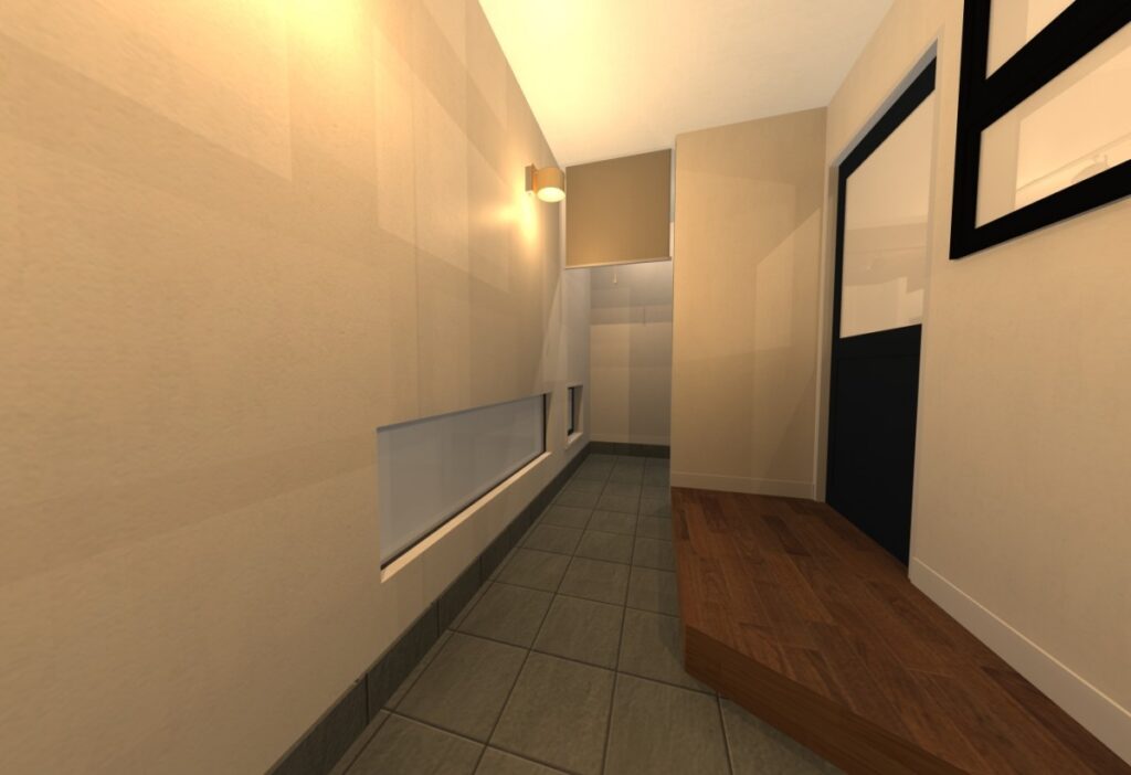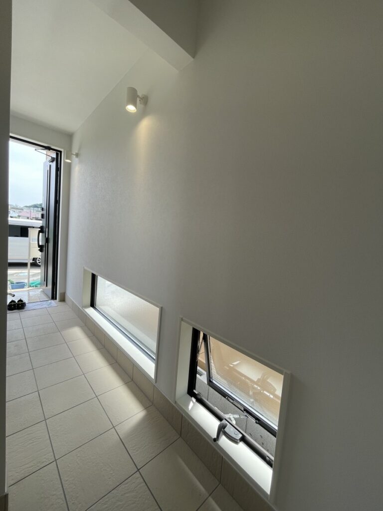 ローサイドライト(低い位置の窓)は昼間足元に優しい光を取り入れてくれます。高さを揃えることで玄関とシューズクロークとのつながりを強調しています。