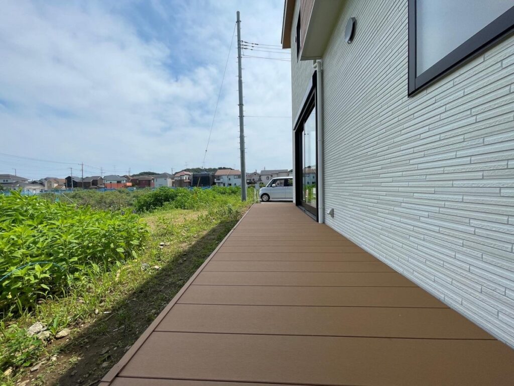 建物の奥行一杯の長さで設置したデッキは、対面キッチンの回遊しにくさを、一度デッキに出ることでリビングにアクセスできるという役割も担っています。