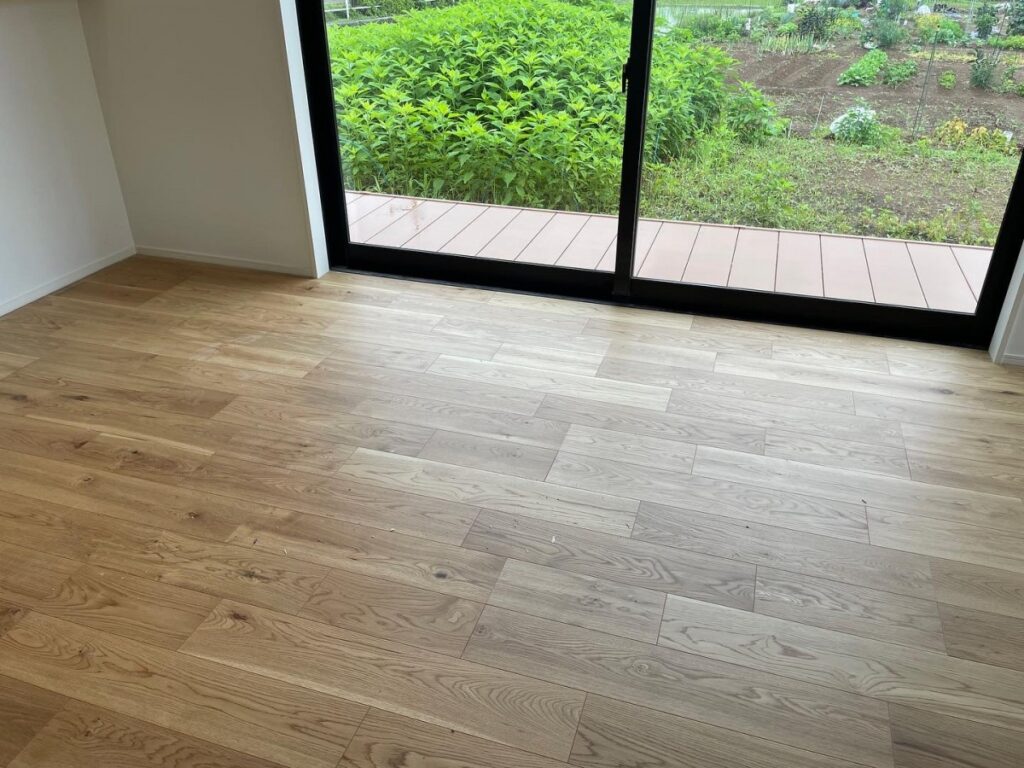 弊社が標準で採用している、朝日ウッドテックのフローリングは表面の突板が厚く、シートフロアに比べると、無垢のフローリングに近い感触です。