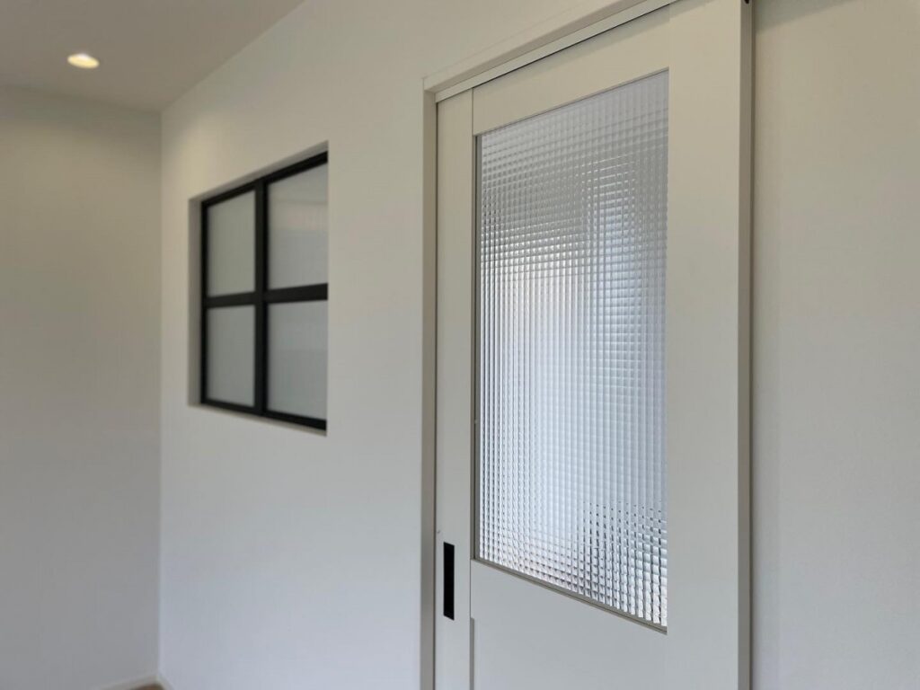 玄関に入ると隣接するリビングとの間の壁にインテリア用の窓を設けています。