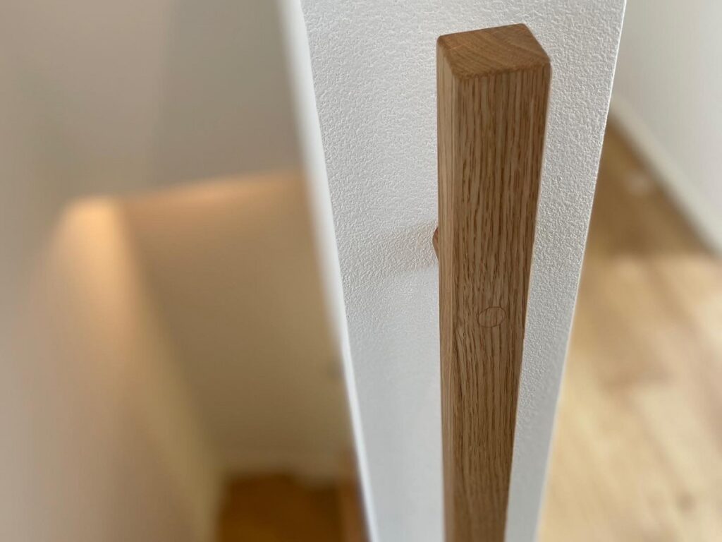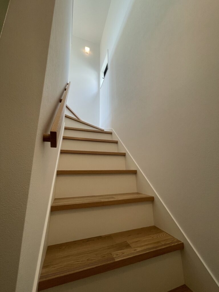 よりシンプルに見せる為、踏板は床材と同色としていますが、蹴込板を白を採用することで圧迫感を軽減しています。