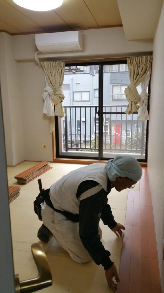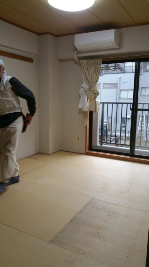 朝一番に、大工さんと現場に乗り込みます。まずは和室のフローリング工事。