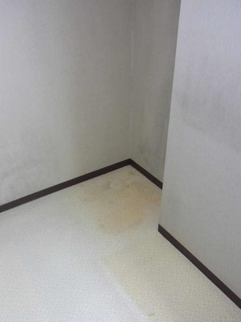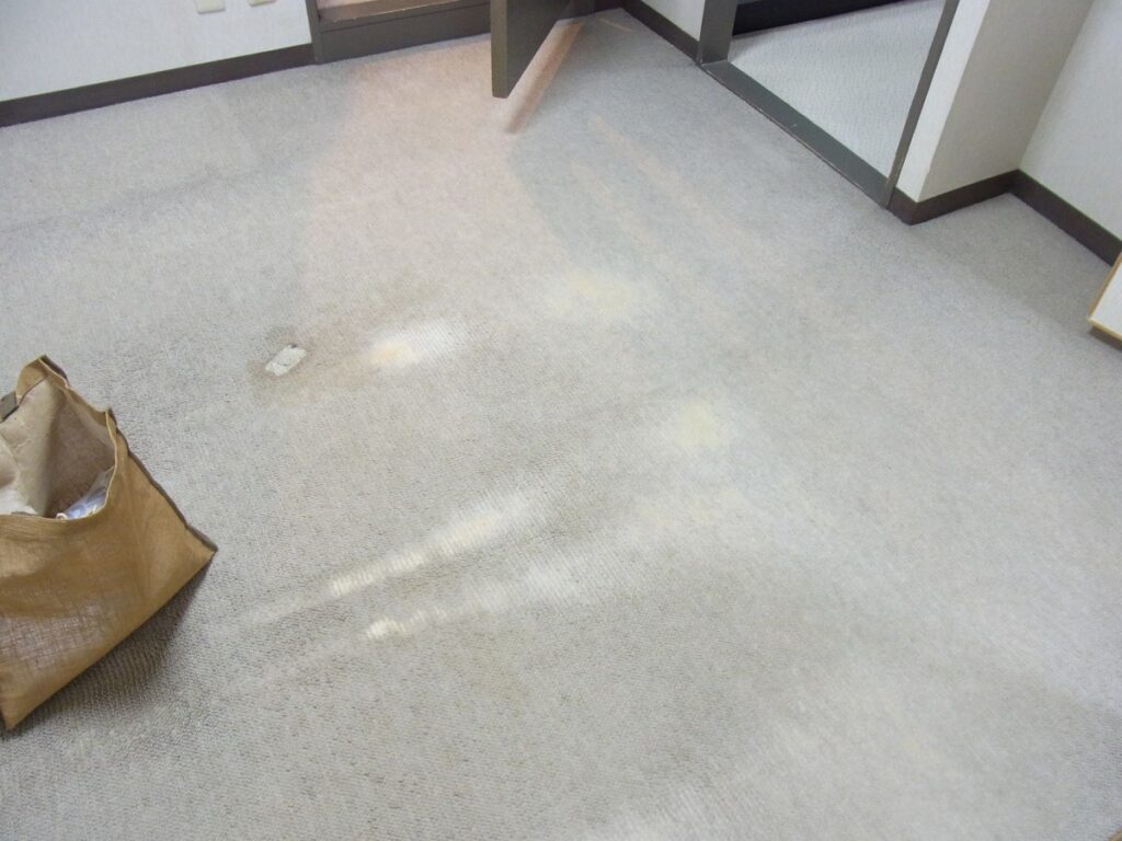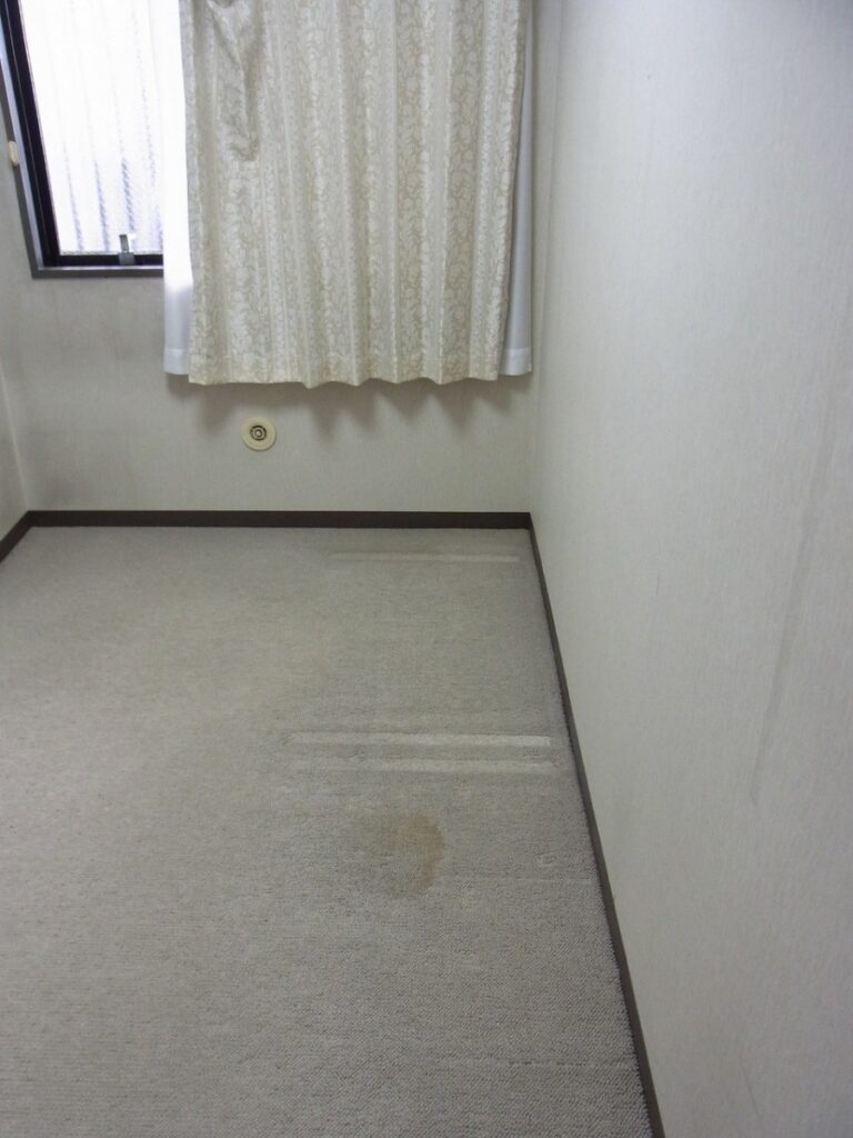 しかし、よく見ていくとクロス自体も経年劣化で薄汚れていましたし、なにか重量物(こたつ等)を設置されていたのかカーペットもかなり減っていたりといろいろ見えて来ました。