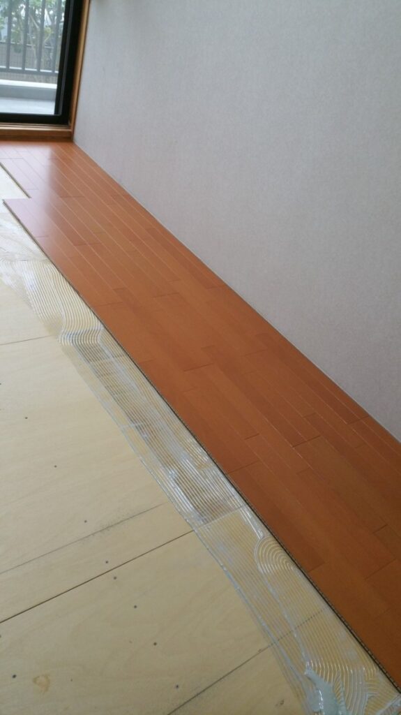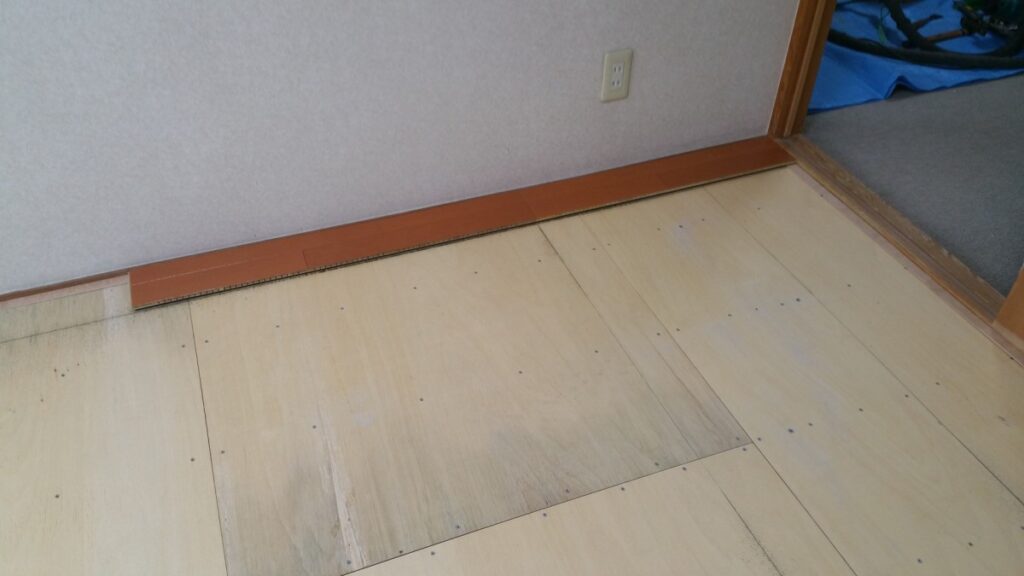 そこで大工さんと2人でべニア板や材木を薄くしたものを「根太」と「コンクリート床(以下スラブ)」の間に挟み高さを調整しながら捨て貼りべニアを貼っていきました。