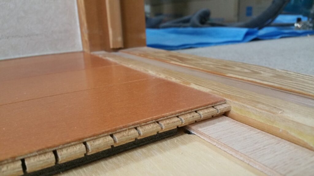 仕上げのフローリングの高さも、入口の敷居から約2㎜下げくらいの美しい「チリ」で収めました。