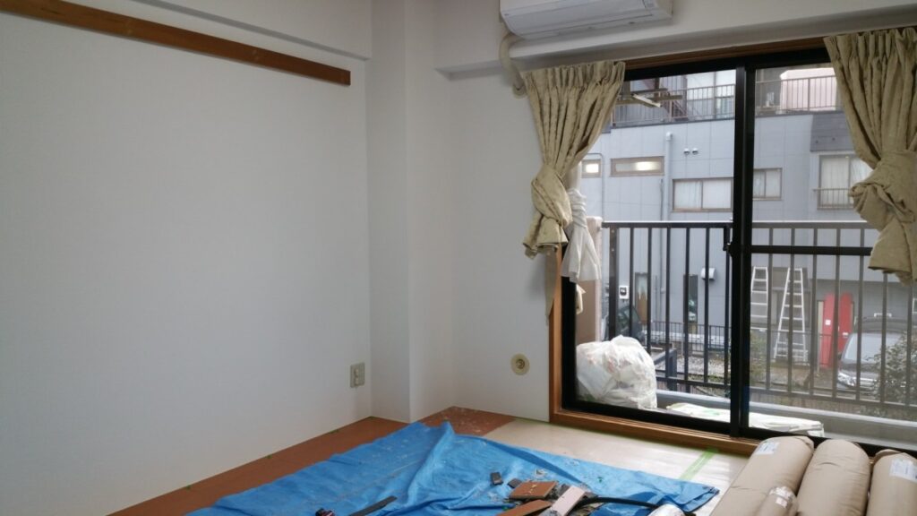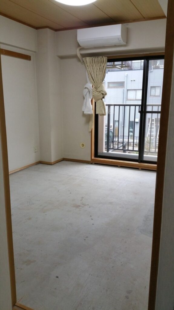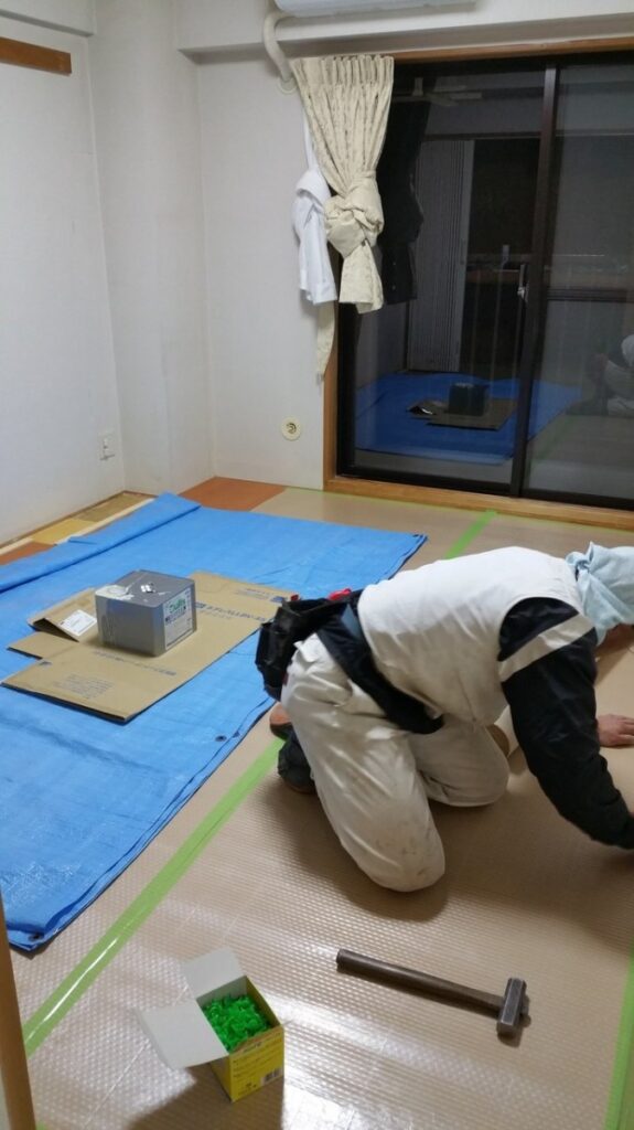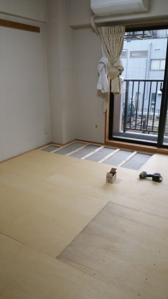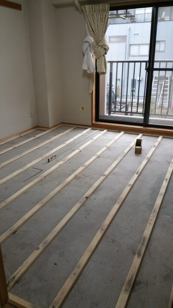 畳を上げコンクリートの床に「根太」を設置していきます。コンクリートの床は残念ながら、「水平」になっていることは稀なケースです。大体、「上から畳を敷くのだからいいだろう!」くらいの感じでしょう。