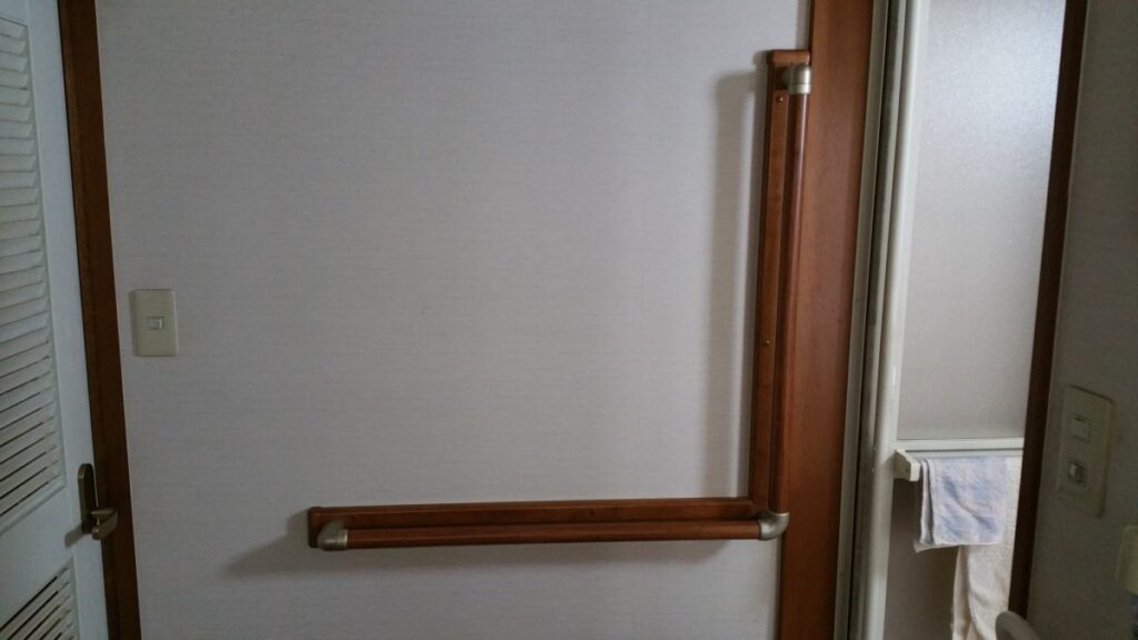 オーナー様、ケアマネージャさんと打ち合わせを行い洗面室にL型の手摺を設けました。
