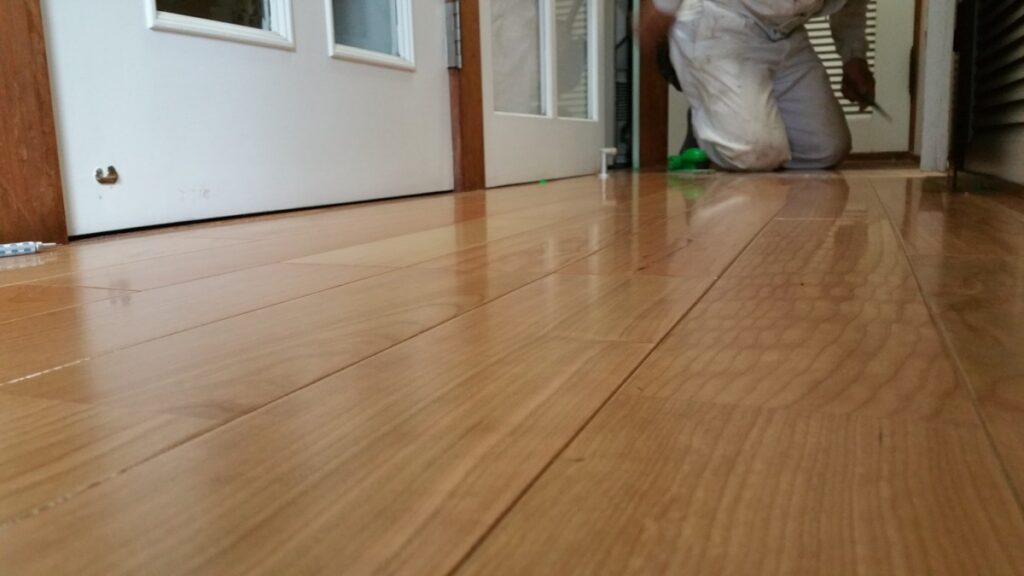 そこで、まずは12㎜の床合板を捨て貼りし、その上に6㎜のリフォームフロアを貼りました。