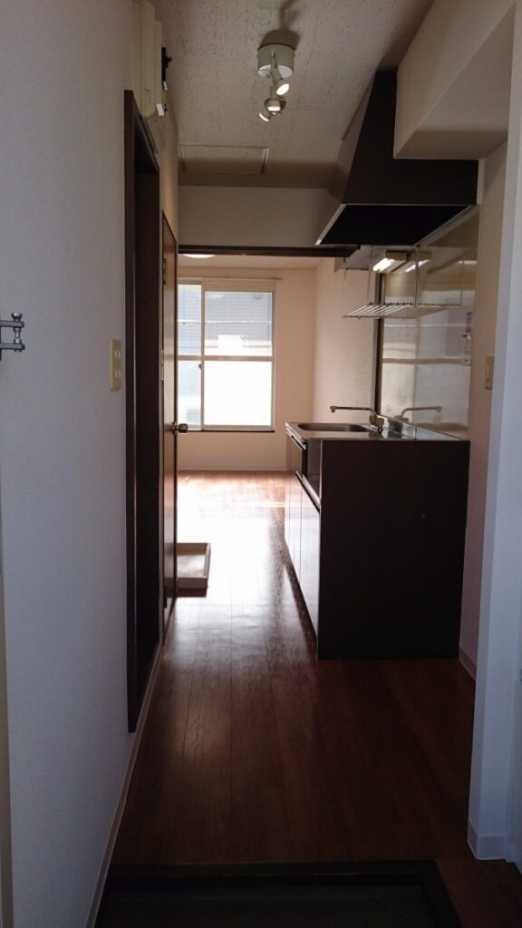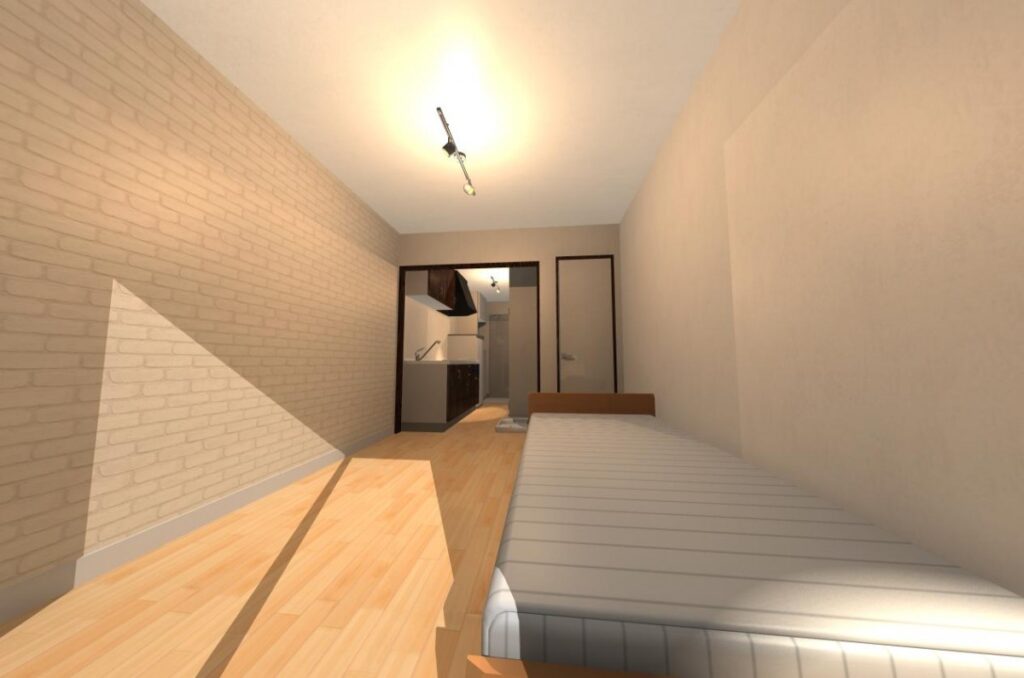 玄関とキッチン、更に居室が一体となった間取りのワンルーム。