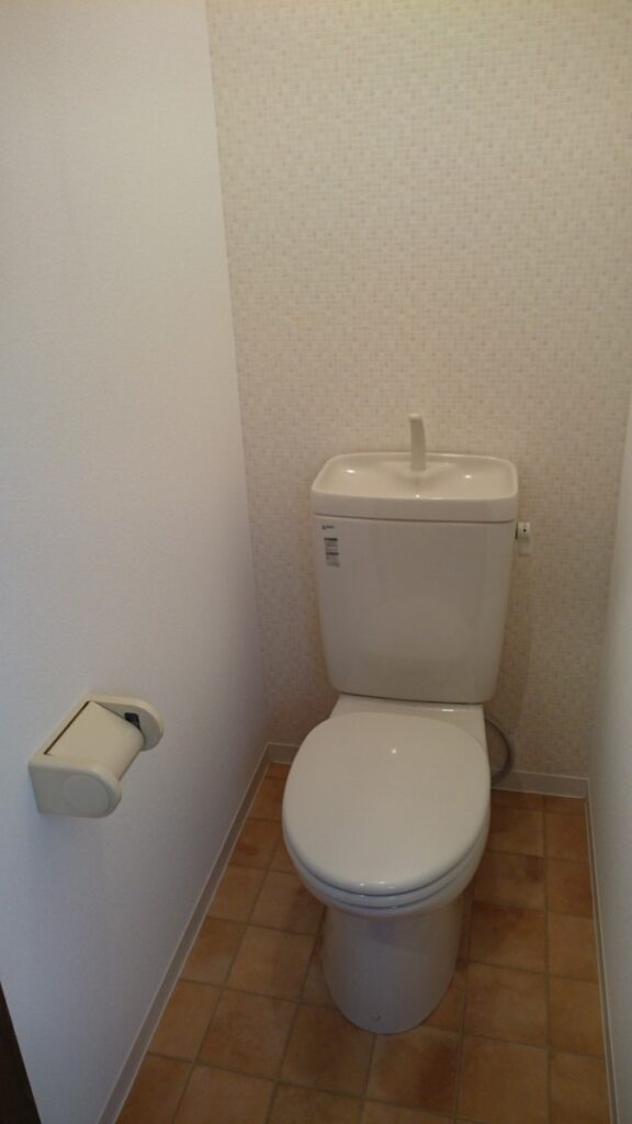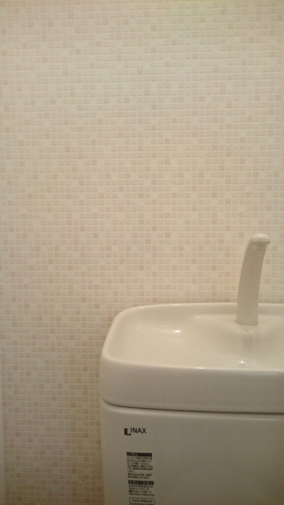 便器背面の小さなタイル調のクロスは女性にも気に入って頂けるように選定致しました。