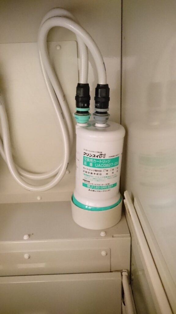 シンクには憧れのビルトイン浄水器。後付の商品とは違い綺麗に収まっています。