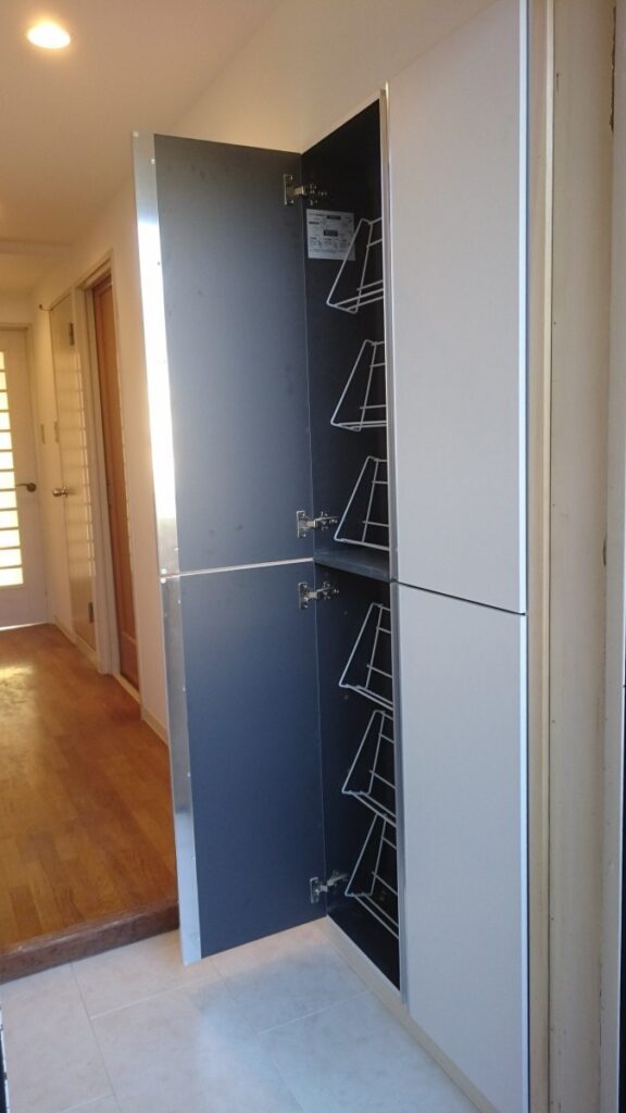 薄型の下駄箱を壁の中に入れることで、シンプルで広い空間を演出しました。