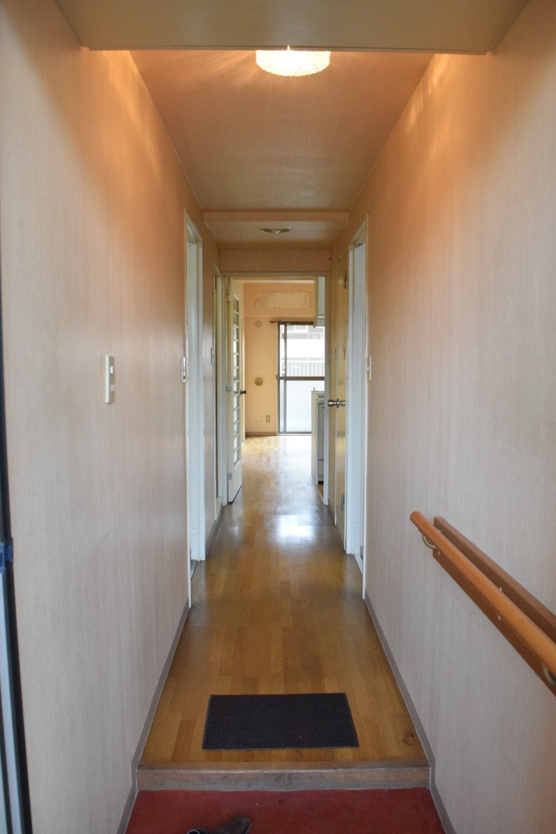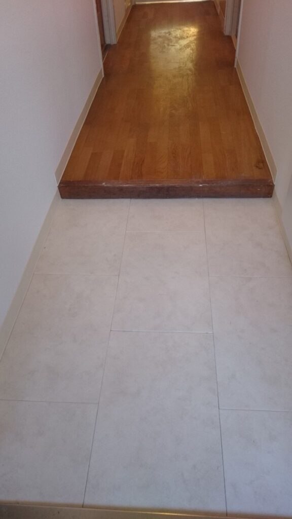 玄関部のクッションフロアを目地が美しいラウンドエッジの白系フロアタイルに変更。