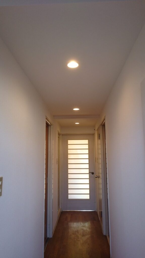 天井のダウンライトも古い雰囲気の大きなものから、小径のLEDダウンライトに変更しました。