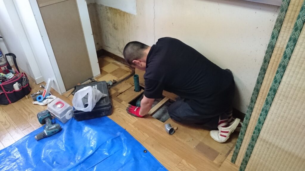 設備屋さんが新しいキッチンにあわせて設備配管をしています。