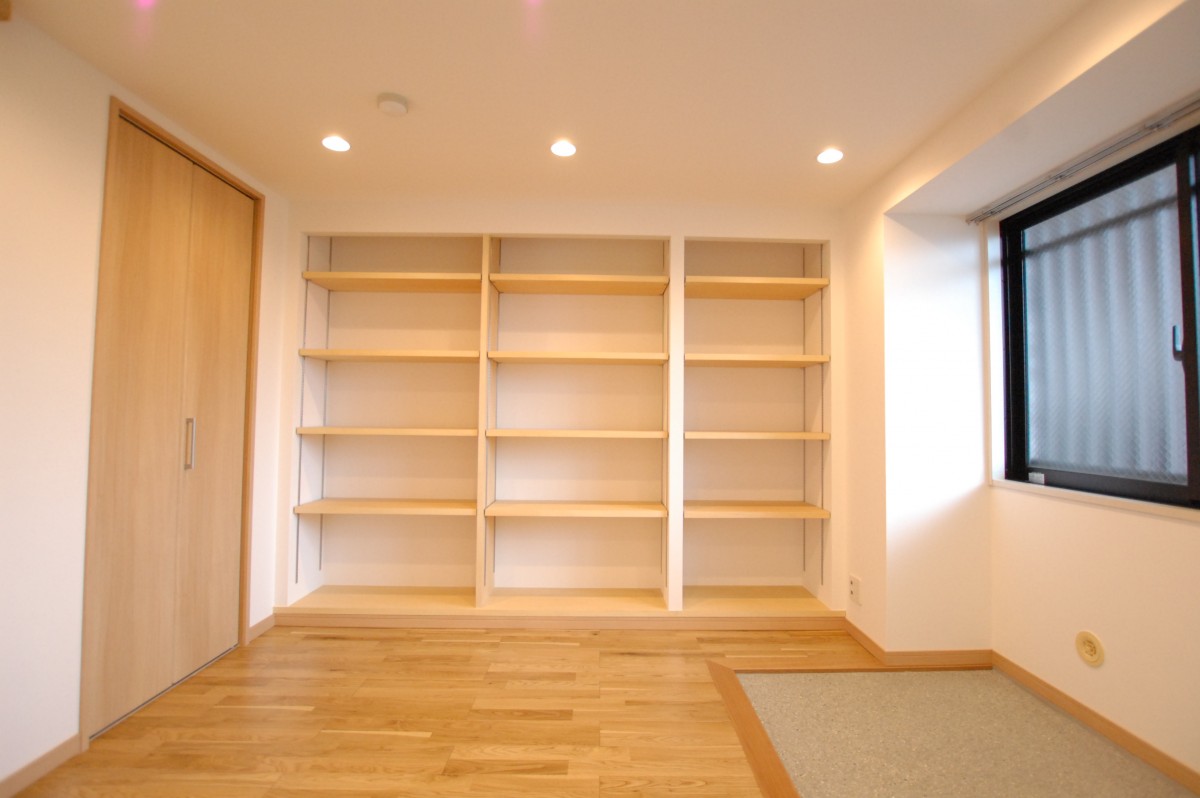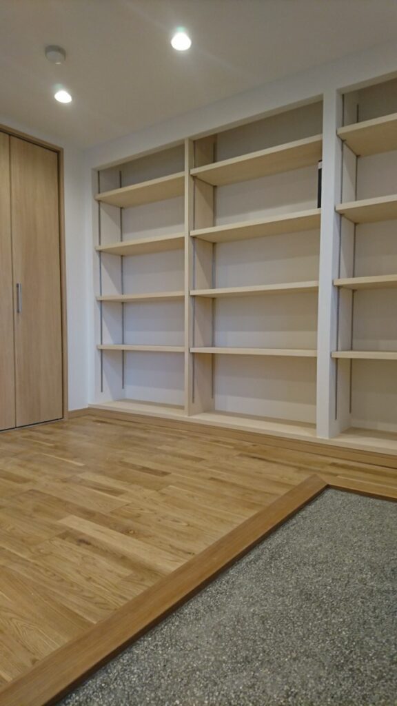 お施主様の一番のこだわりは玄関スペースをゆとりあるものにし、壁面に本を収納出来るように、とのことでした。