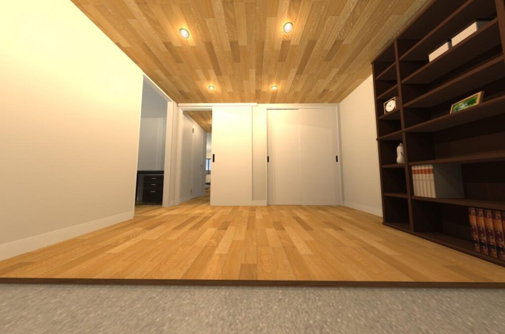 部屋の壁をなくしても、廊下と部屋との天井高に違いがあると目に見えない壁が存在してしまうので、