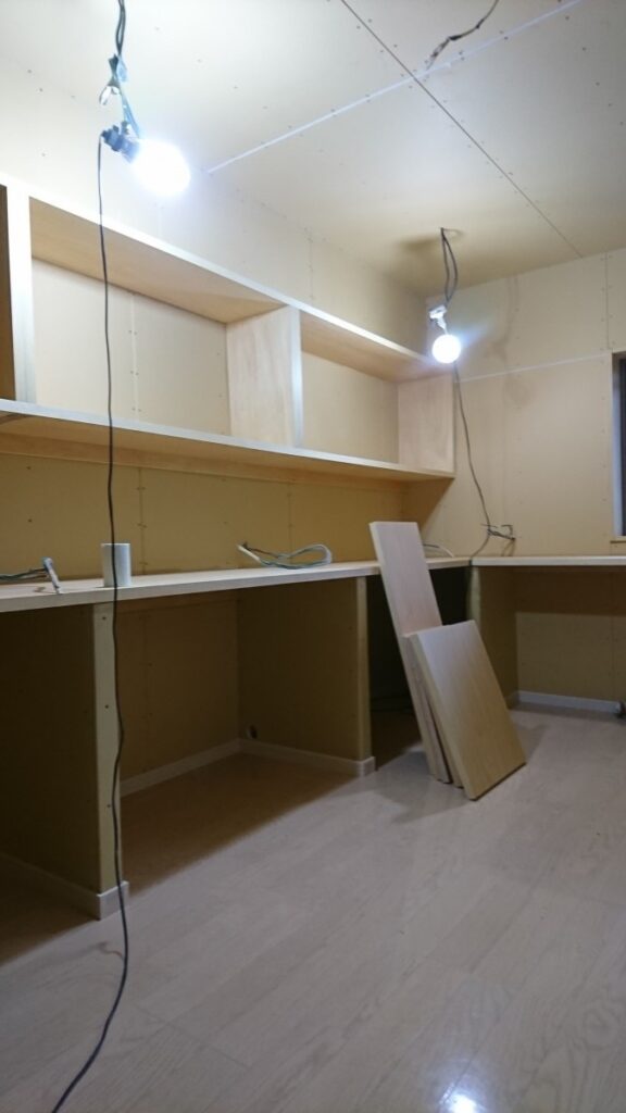 お施主様から、使用する道具や材料がたくさんある為できるだけ収納を多く作りたいとのご要望があり、すべての家具を造作で作らせていただきました。