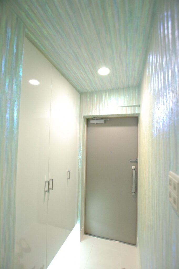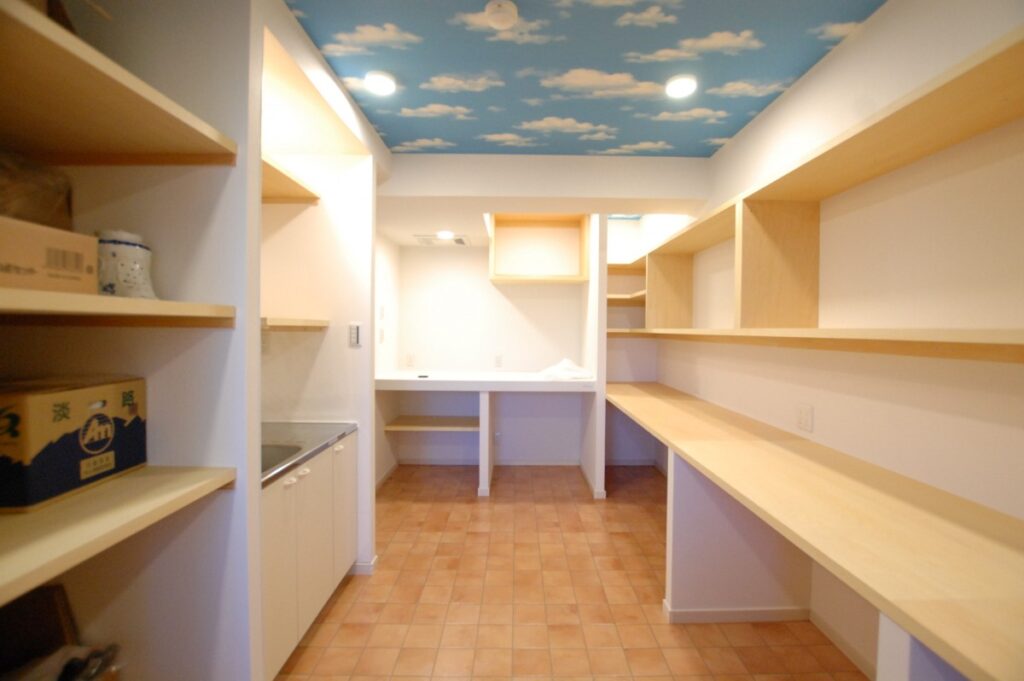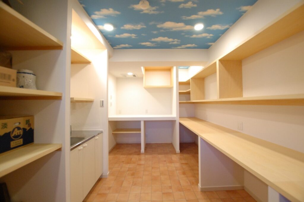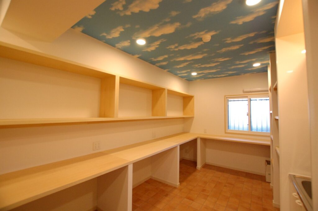 天井の空模様のクロスはお客様のチョイスです。長時間こもって作業されることもあるようで空を感じながら作業できれば多少の気分転換になるのでしょう。