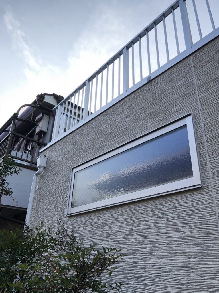 建築を行う上で窓の位置や形も大切です。この写真は南側になります。通常であれば陽の光を入れるために大きな窓にしたいところですが、近隣との関係が隣接するマンションの駐車場となっております。大きな窓を作るとプライバシーや防犯面でも不安を感じます。そこでなるべく高い位置に横長な窓を設け換気や通風、採光がしやすい形としました。そもそもこちらの室の用途は寝室ですのでそれほど採光は必要ないと考えてのデザインにさせて頂きました。