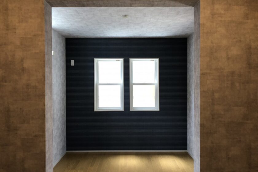 建築を行う上で窓の位置や形も大切です。この写真は南側になります。通常であれば陽の光を入れるために大きな窓にしたいところですが、近隣との関係が隣接するマンションの駐車場となっております。大きな窓を作るとプライバシーや防犯面でも不安を感じます。そこでなるべく高い位置に横長な窓を設け換気や通風、採光がしやすい形としました。そもそもこちらの室の用途は寝室ですのでそれほど採光は必要ないと考えてのデザインにさせて頂きました。