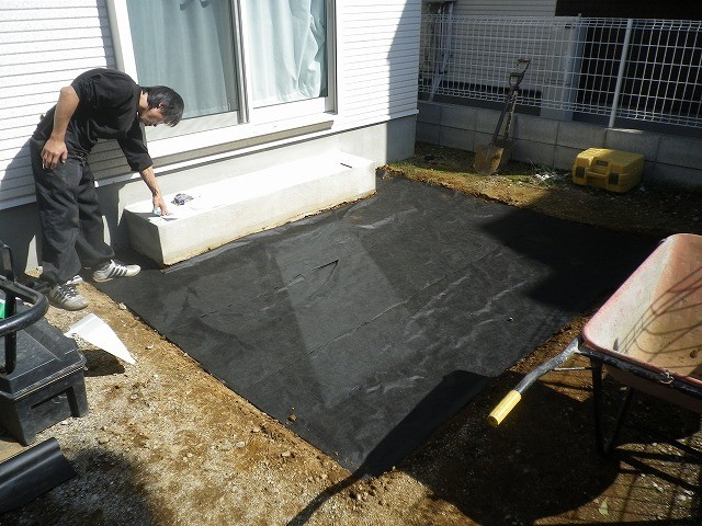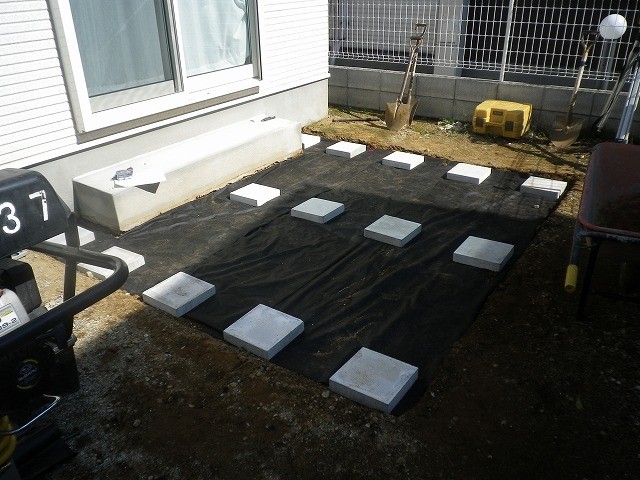 設置した防草シートの上に基礎となるコンクリート平板を設置して行きます。