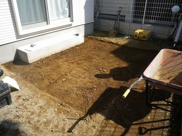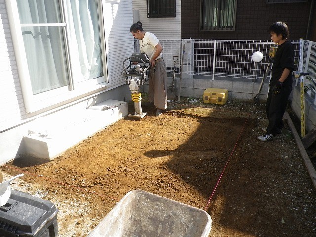 地盤面の土を鋤とって締固め地盤面を造ります。