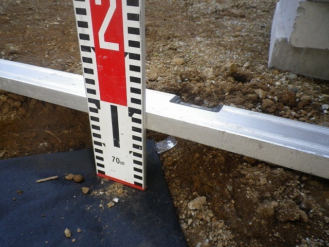 地盤面はできるだけ平滑に仕上げて置きましたがやはり不陸(平坦でない)があります。