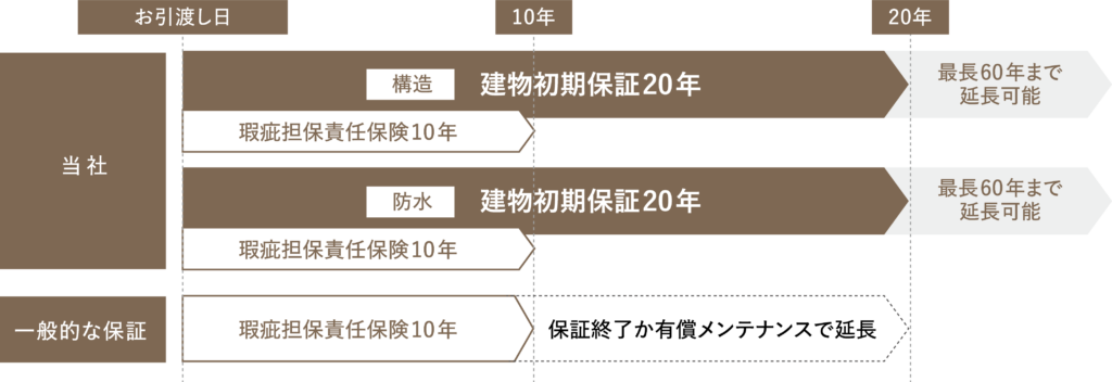 2026年1月から『ずっと続く安心』を保証する為に、第三者(株式会社ジャパンホームシールド社)による、20年の長期保証(最長60年保証)を標準採用することに致しました。