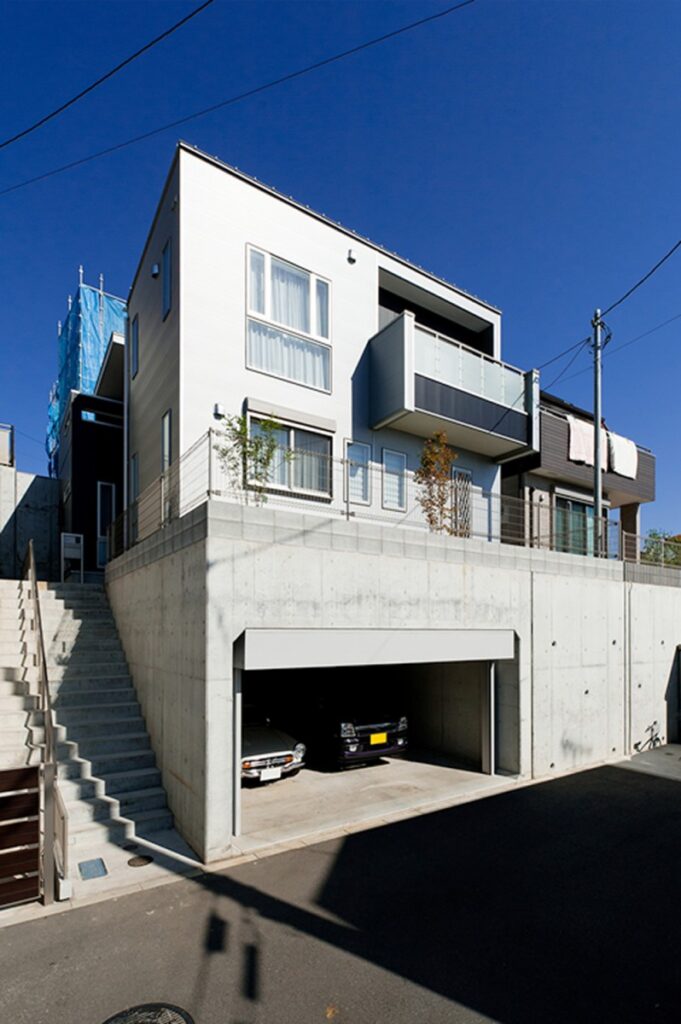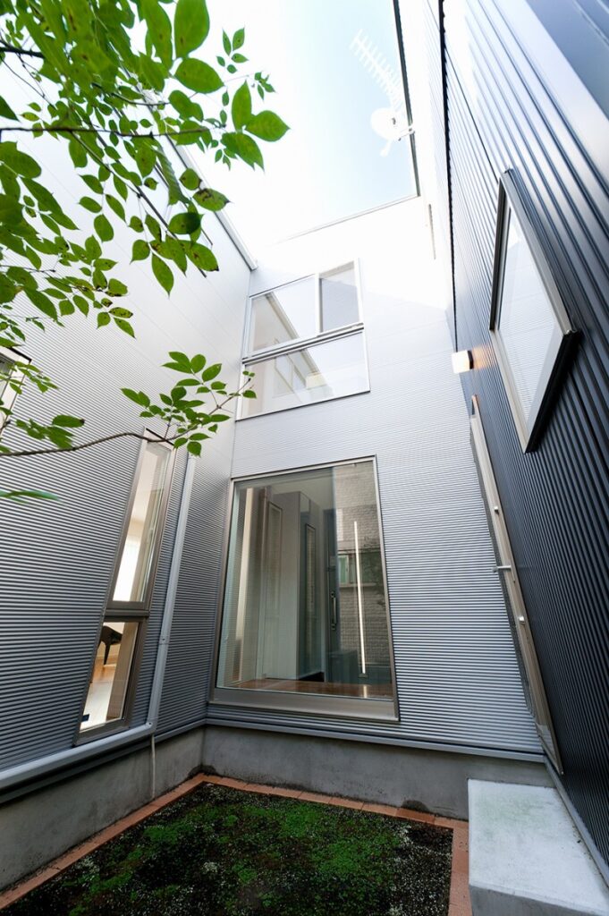 中庭を利用することでほとんどの部屋が3面以上の採光が採れます。さらに中庭に落ちる光を利用する為、シルバーの外壁を選び、乱反射をさせ一層明るく演出しています。