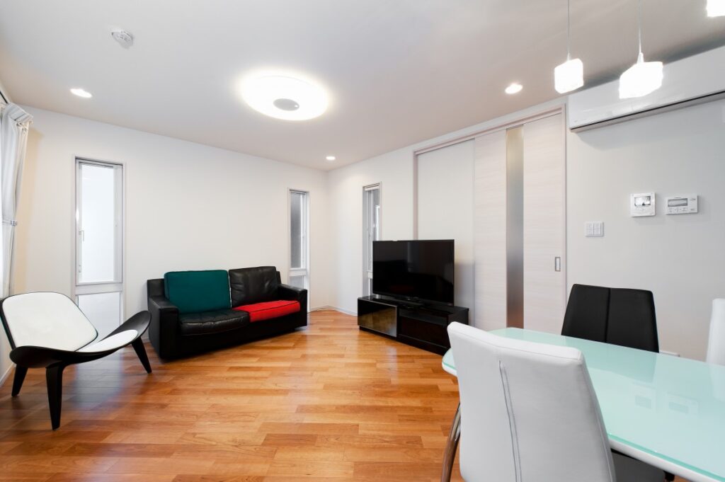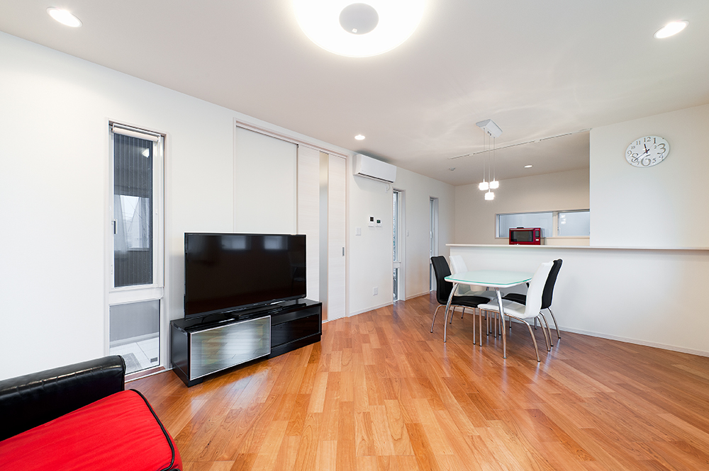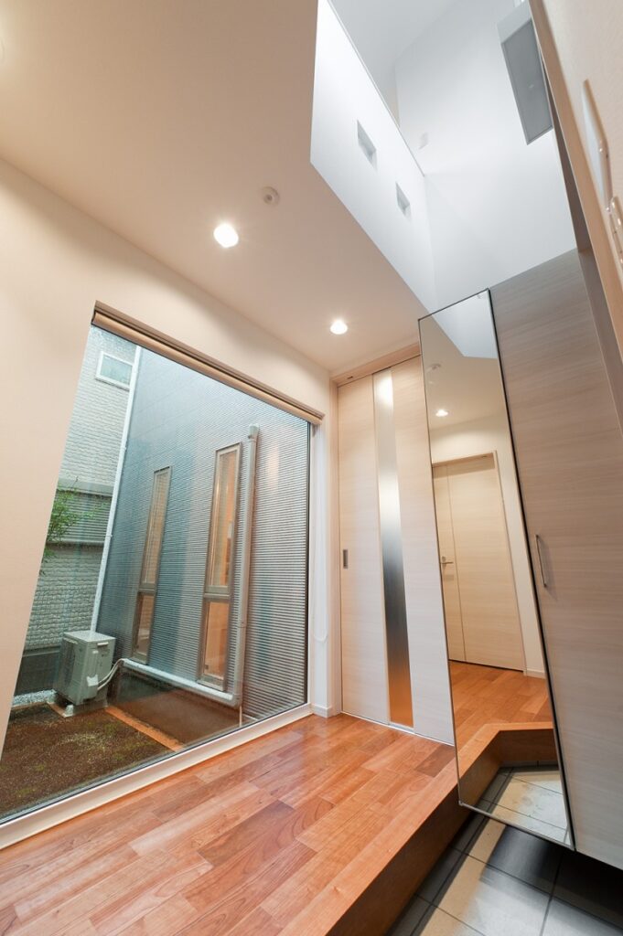 玄関を開けると眼前には大きなFIX窓を設け来客を迎えます。