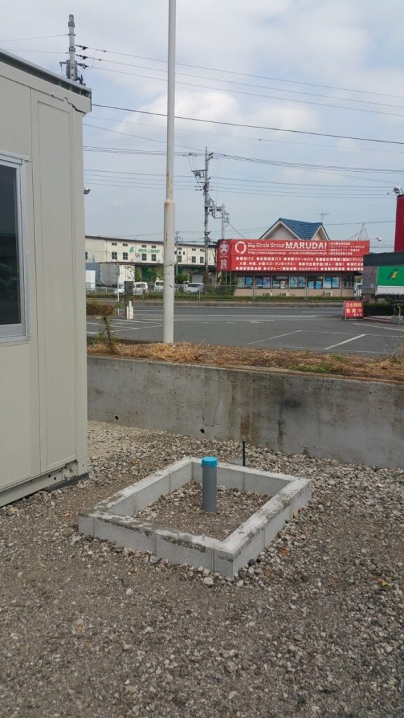給排水工事は事務所から分岐しこの位置に引き込みました。