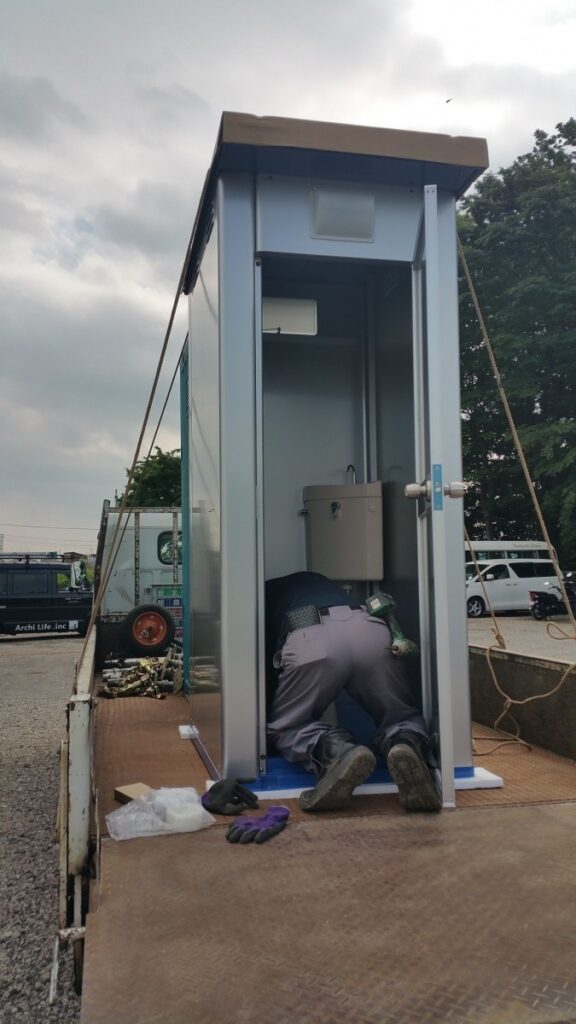 トイレを搬入し、設置工事をおこないます。