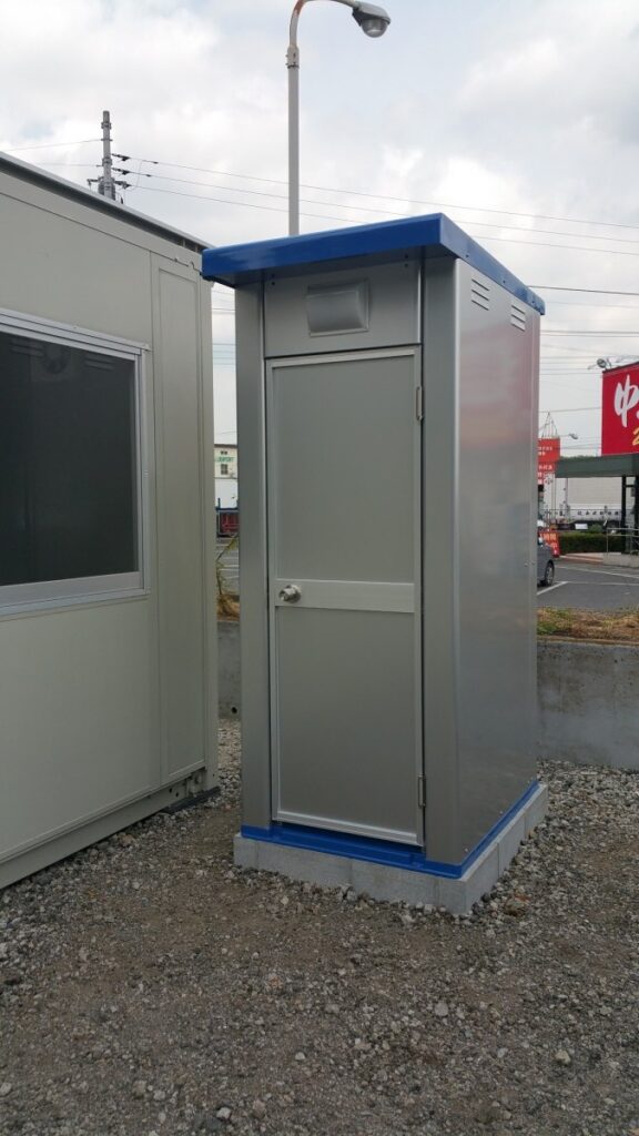 基礎工事時にアンカーボルトを所定の位置にあらかじめ設置しておきましたので仮設トイレを載せてナットを絞めて固定完了。