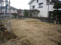 まずは、杭を四隅に立てます。この時に、隣の家との境(以下:隣地境)からの距離を出します