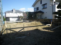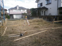 建築工事を行う為に、建築予定地の「どの位置にどんな形の家を建てるか?」を、材木(杭・貫)で出します。
