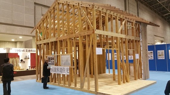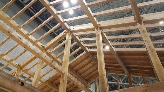 これが会場内に展示された「仮設木造住宅」の原寸軸組模型です。(はっきり言って実物ですよ)
