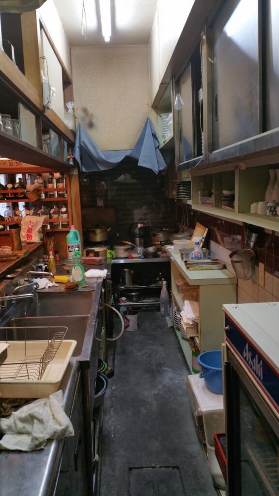 キッチン:決して十分とは言えないスペースではありました、収納がしっかり確保され一人で作業されるにはいいスペースだったのではないでしょうか?カウンターとの関係性によりキッチンの横移動がかなり長かったので、店先の焼き台と後ろの冷蔵庫の行き来には苦労なされたのではないでしょうか。