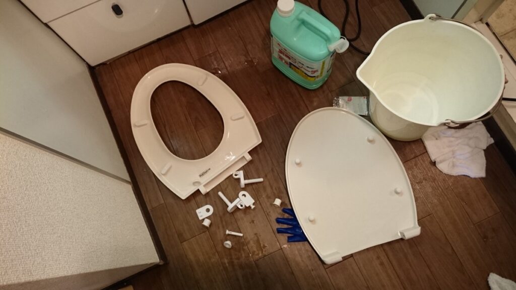 便蓋、便座を分解し、大きな部品は丸洗い、小さな部品は漂白剤に浸し清掃していきます。