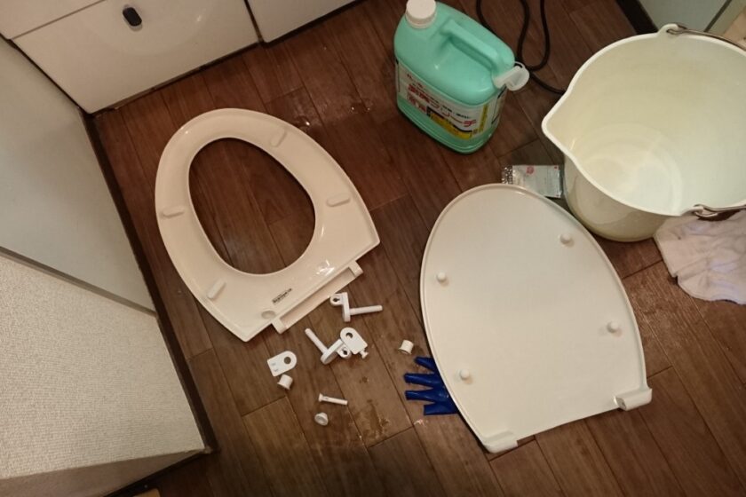 便蓋、便座を分解し、大きな部品は丸洗い、小さな部品は漂白剤に浸し清掃していきます。