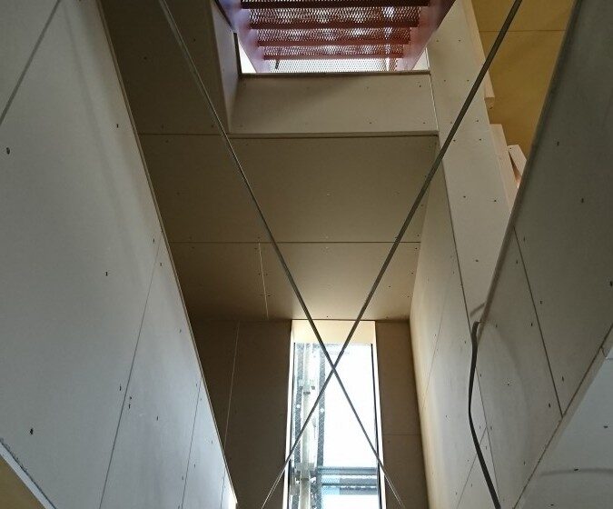 この建物は廻りを囲まれた狭小地に建築されている為、如何に上部から光を取り入れるかが大きな問題だったのでしょう。