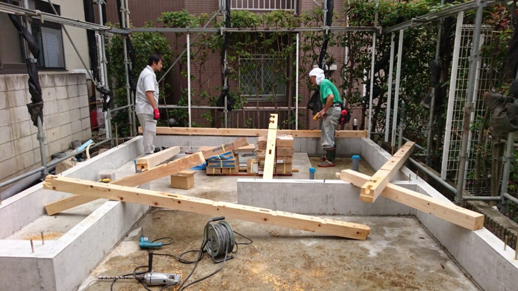 今回の建物は1階が土間仕上げとなっている為、『土台』は有りますが、『大引き』はありません。