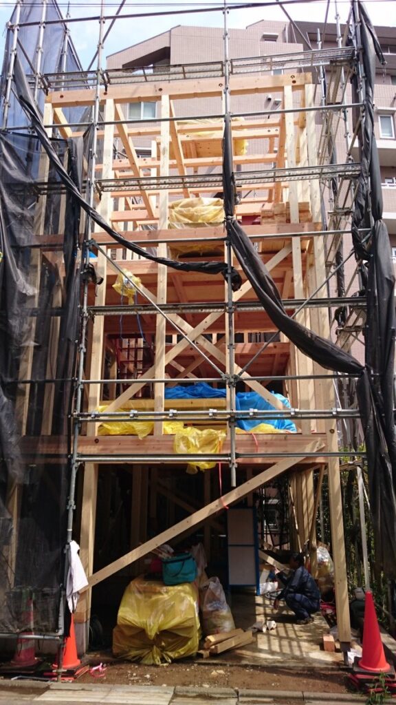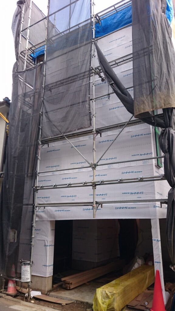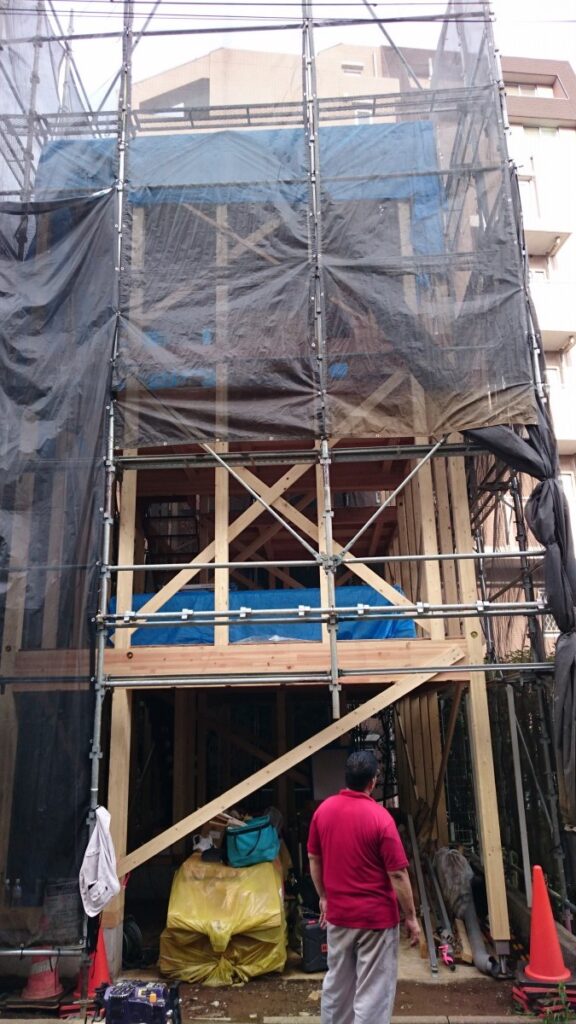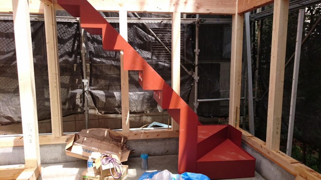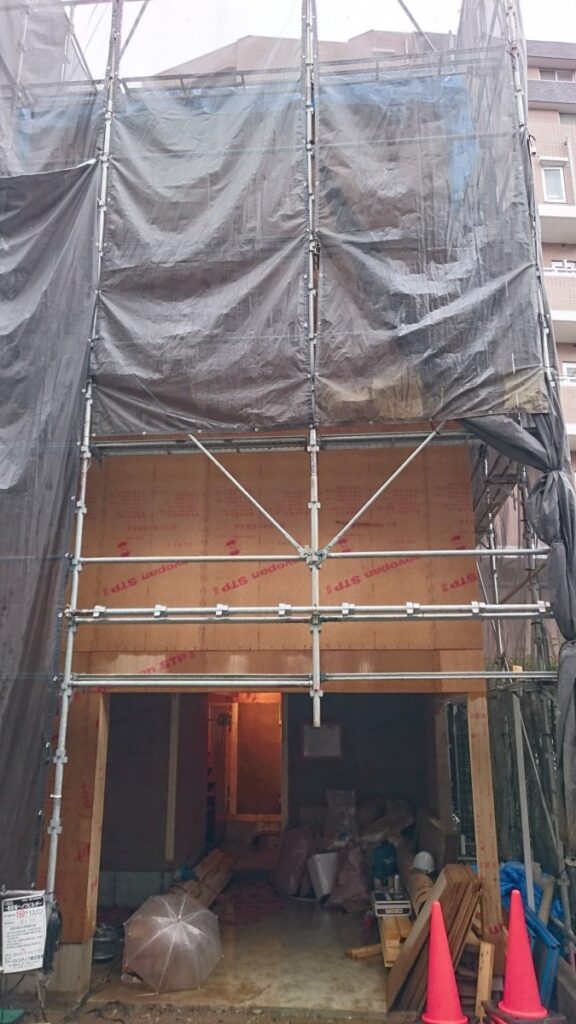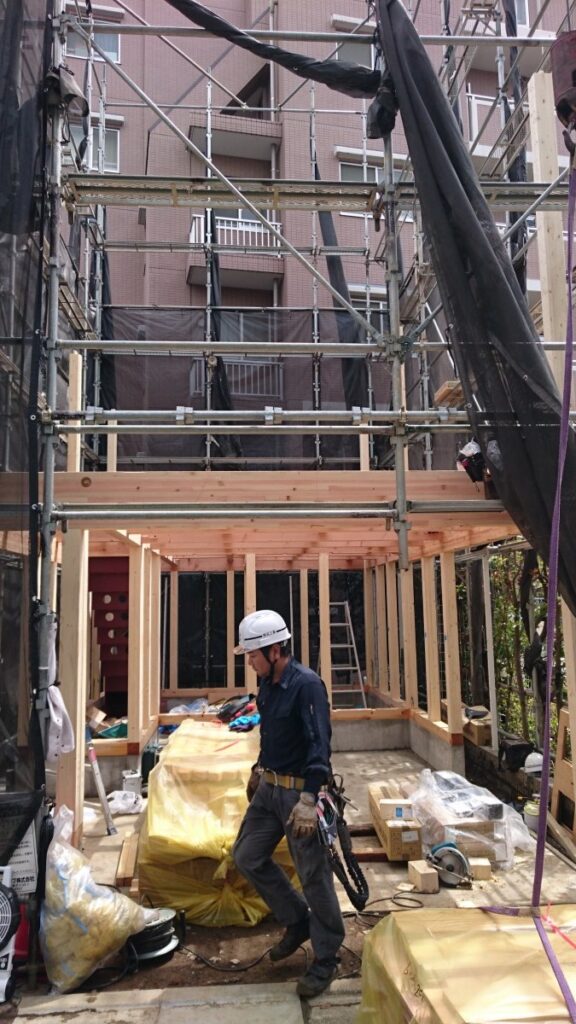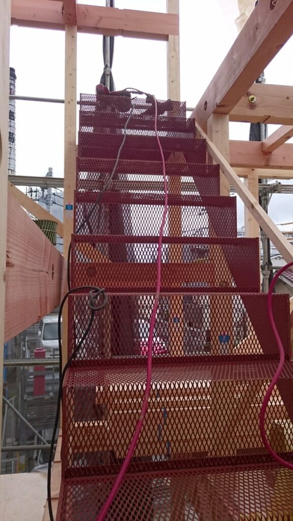 今回は鉄骨階段の設置や狭小地であることなどの諸事情により『建て方』を2日間で行いました。