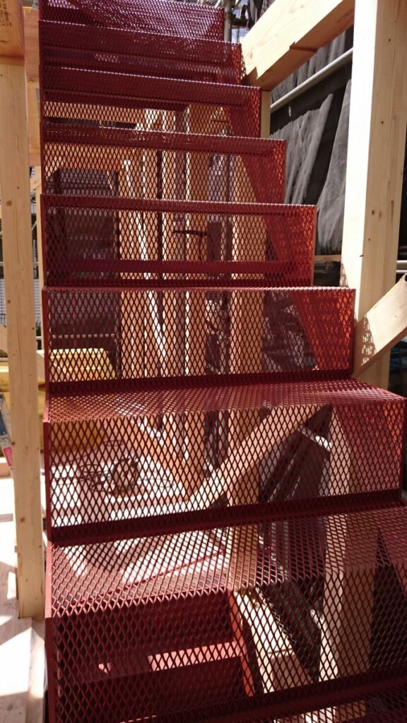 設計事務所の先生が、採光のために拘られたエキスパンドメタルを使用したシースルー階段が、非常に豊かな表情を醸し出しております。