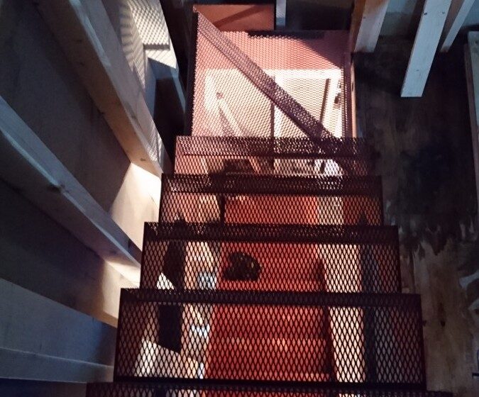 設計事務所の先生が、採光のために拘られたエキスパンドメタルを使用したシースルー階段が、非常に豊かな表情を醸し出しております。