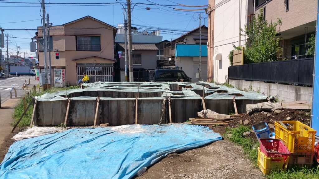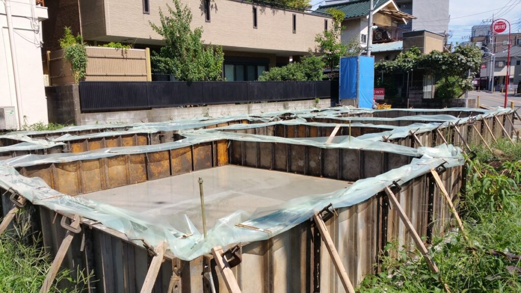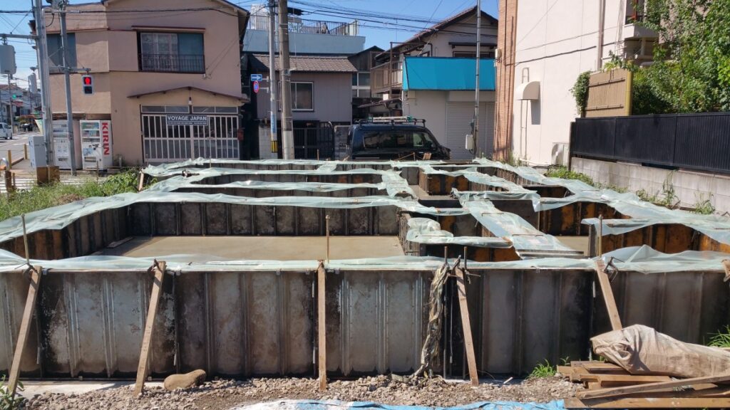 昭島市昭和町でおこなっております木造耐火建築新築工事。 前回のブログで、基礎コンクリート打設工事まで行ったご報告をさせていただいたと思います。 コンクリート打設後、コンクリートの硬化期間中養生をしておりました。