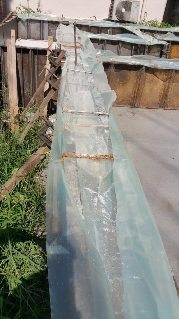 型枠の上部にビニールシートを設置し、急激な乾燥や、雨水、寒さ(今回の場合は関係なし)より基礎を守ります。