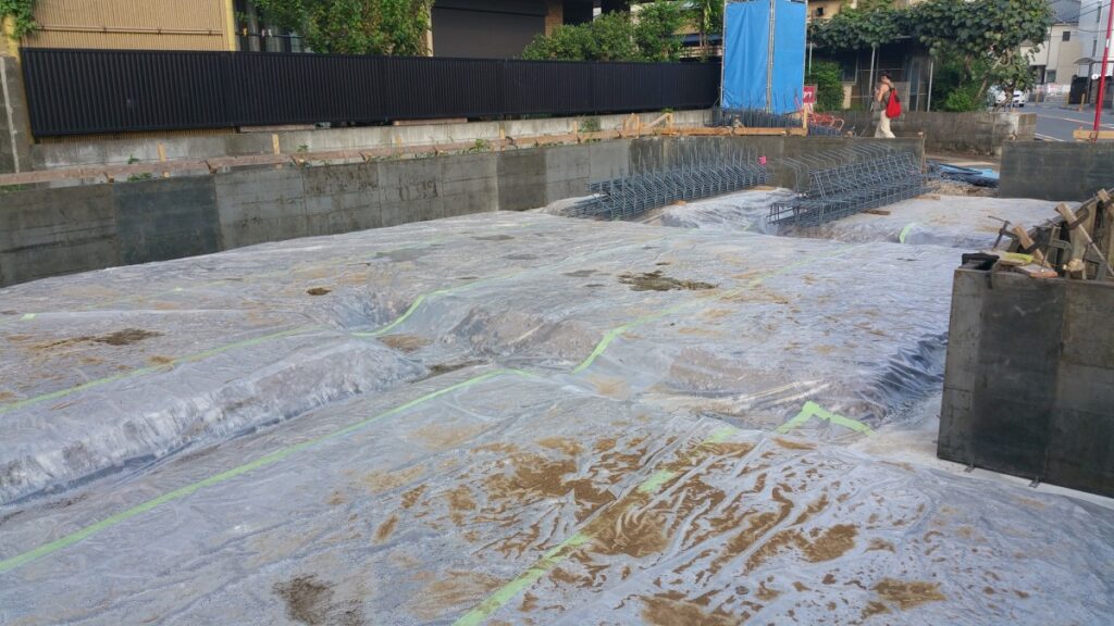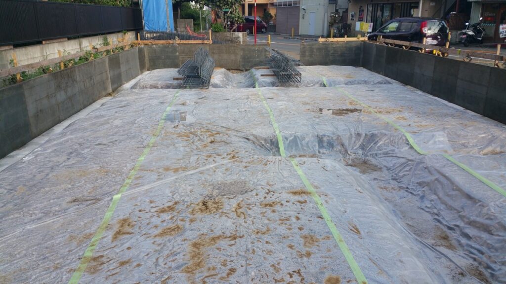 『根切工事』が完了すると、地面からの湿気を防ぐために『防湿シート』を設置致します。シートを施工した後日、確認すると地面に接する面には水滴がびっしりついていました。これは、地面からの湿気を確実に食い止めている証拠だと思います。床下の湿気は木造建築にとって嫌なモノです。湿気は本体の材木を腐らせ、シロアリを呼びます。しっかり施工しておく必要がありますね。